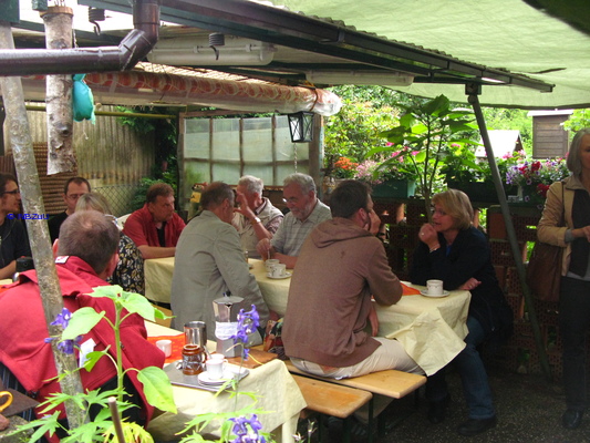 Zusammen mit seiner Frau Lilli hat Imkerpate Detlef Krause zur Besichtigung seines Bienenstandes eingeladen. Regen? Wetter? Das hat man gar nicht bemerkt. Behütet unter großen Planen gab es erst einmal reichlich Kaffee und Kuchen und es waren viele gekommen, viele neugierige Imkerkollegen.